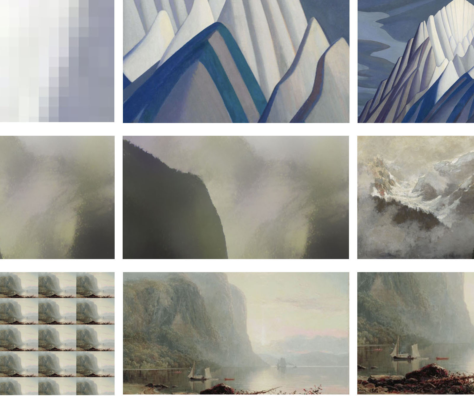 Discovering 4 paintings by artists featured at the National Art Gallery: Allen Harding Mackay, Lucius O'Brian, Lawren Harris and Bell Smith. The paintings are revealed through camera movements and effects, transitioning from extreme close-up, pixelated surface, to wide shot.